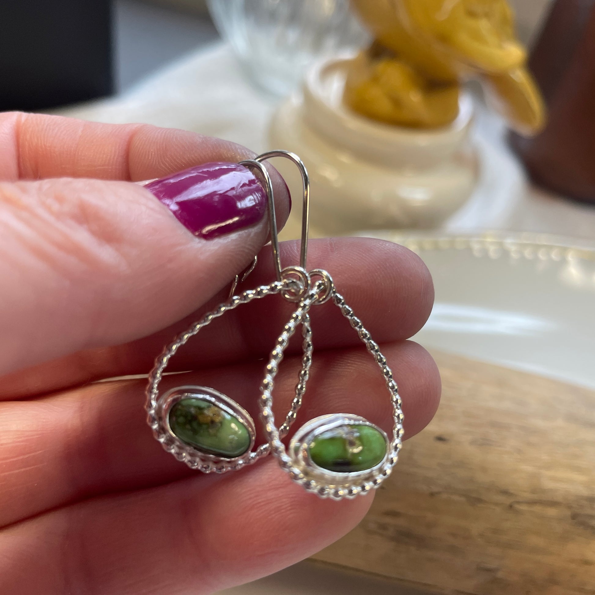 Daydreams are just the best! They bring us joy and lend us a vision of what we may not have dreamt yet! Toss on these sterling silver turquoise Daydream Drop Hoops and get to dreaming...even if you are only driving to the grocery store!