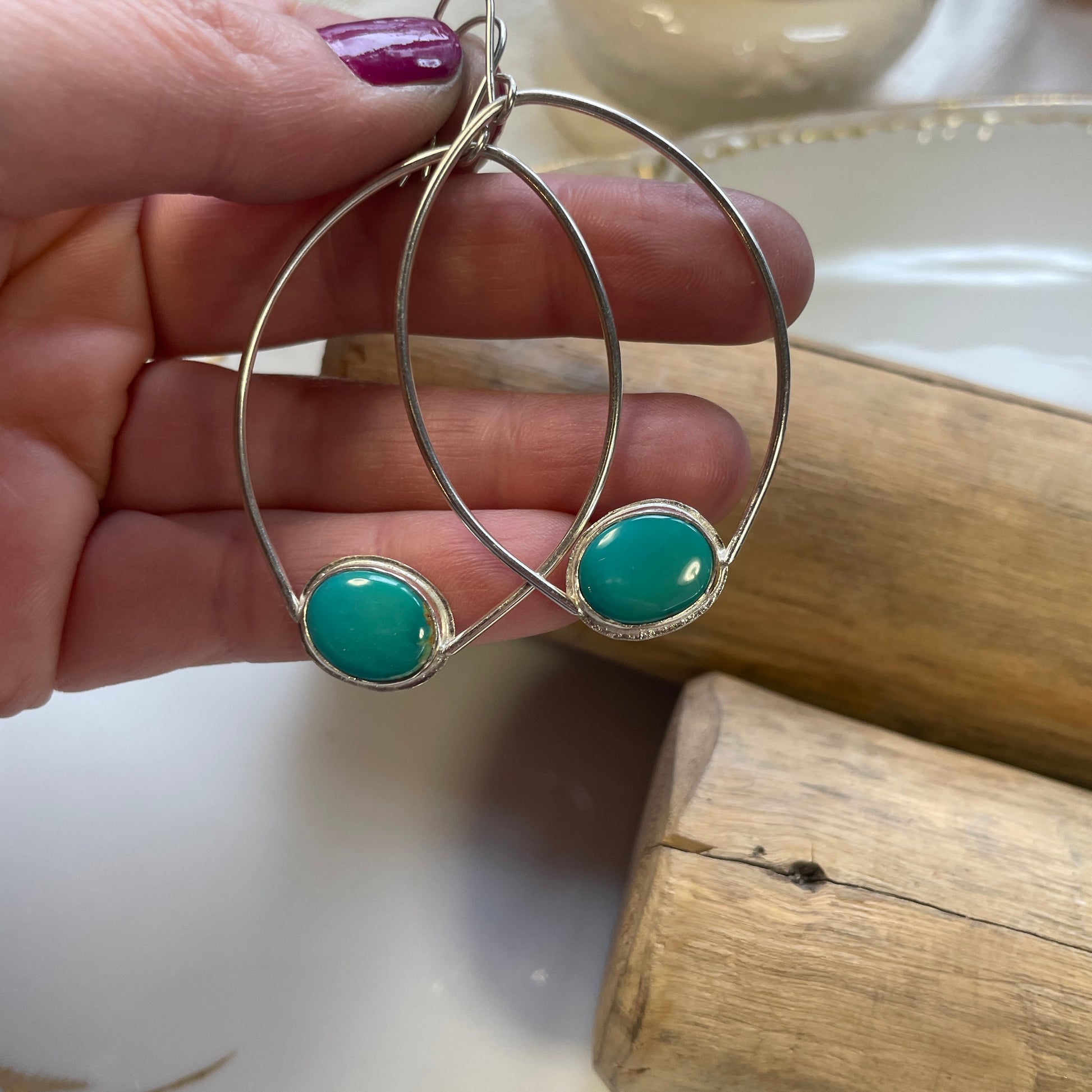 Forged intuitively by hand, each turquoise stone is encased with both Sterling and Fine Silver. Due to the nature of crafting these beauties by hand the piece may showcase the occasional tool mark, joint or a bit of solder offering each piece its own personality. Earring hooks are cut and shaped by hand from Sterling Silver wire.